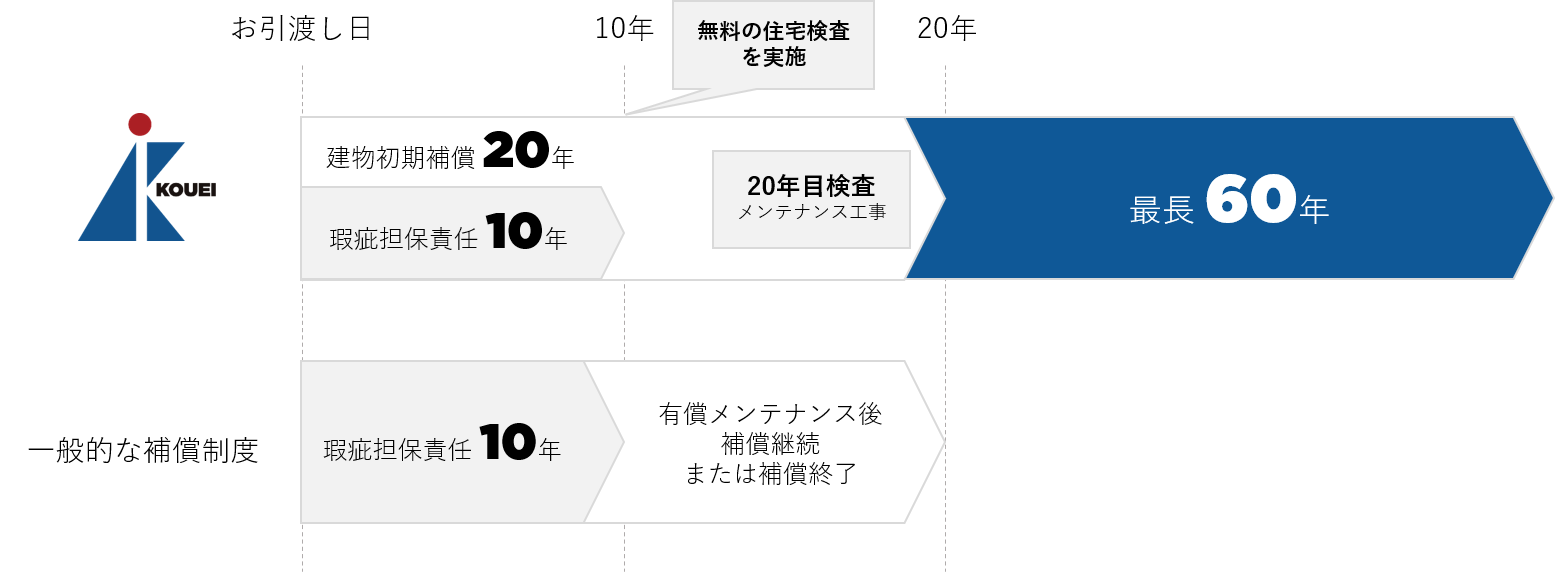 ※ 建物において重要な構造(構造耐力上主要な部分)・防水の不具合(雨水の侵入を防止する部分)の不具合は、法律で10年と定められています。そのため、住宅会社の保証は10年間というのが一般的ですが、当社はお客様に長期の安心をご提供するために初期保証を20年間(最長60年)としております。